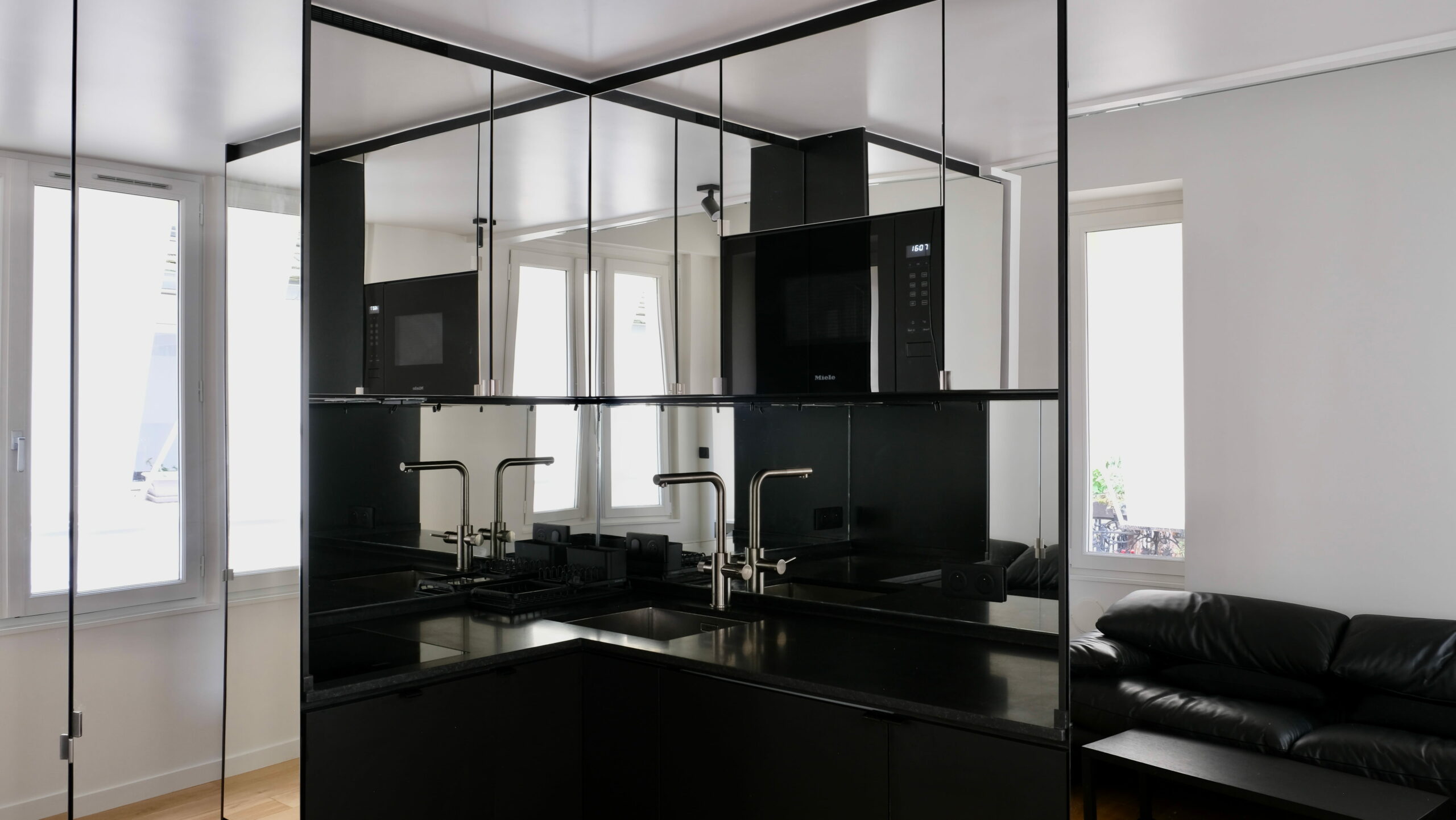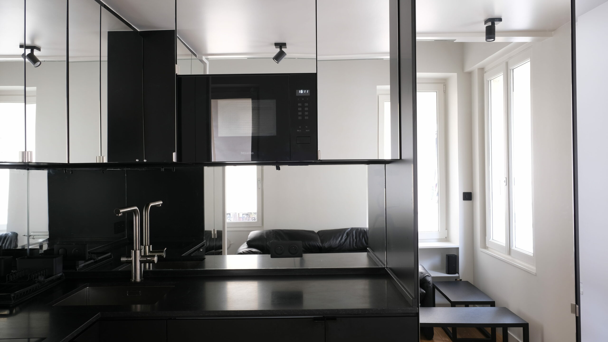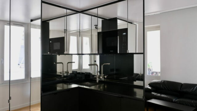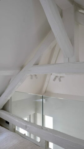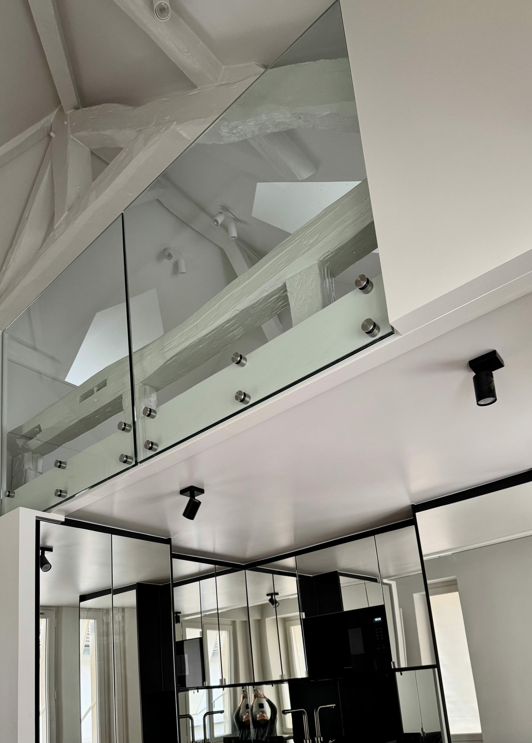 Une partition des espaces a été créée avec des cloisons paravents et le mobilier. Celui-ci est noir, selon le souhait du maître d’ouvrage, et distinct de toute l’enveloppe, traitée en blanc cassé/craie. La charpente est volontairement laissée apparente, bien qu’ayant subi pas mal d’outrages dans de précédentes rénovations, et peinte pour échapper à l’aspect rustique du bois patiné. L’importance des miroirs : en cuisine, sur le seul mur aveugle, ils estompent l’angle et permettent de rester en lien avec l’une ou l’autre fenêtre. En entrée et en SDD, utiles pour s’assurer de sa silhouette.