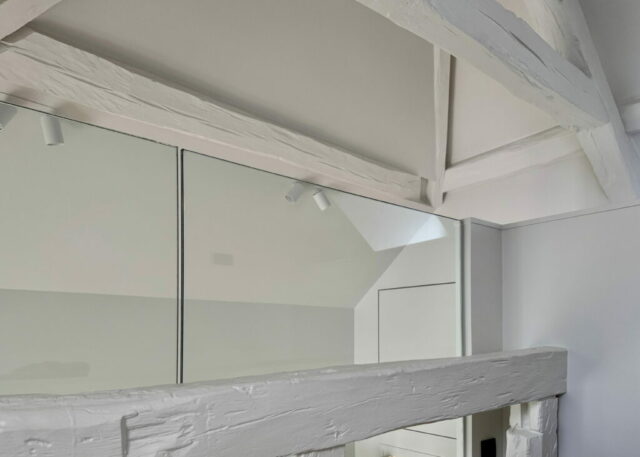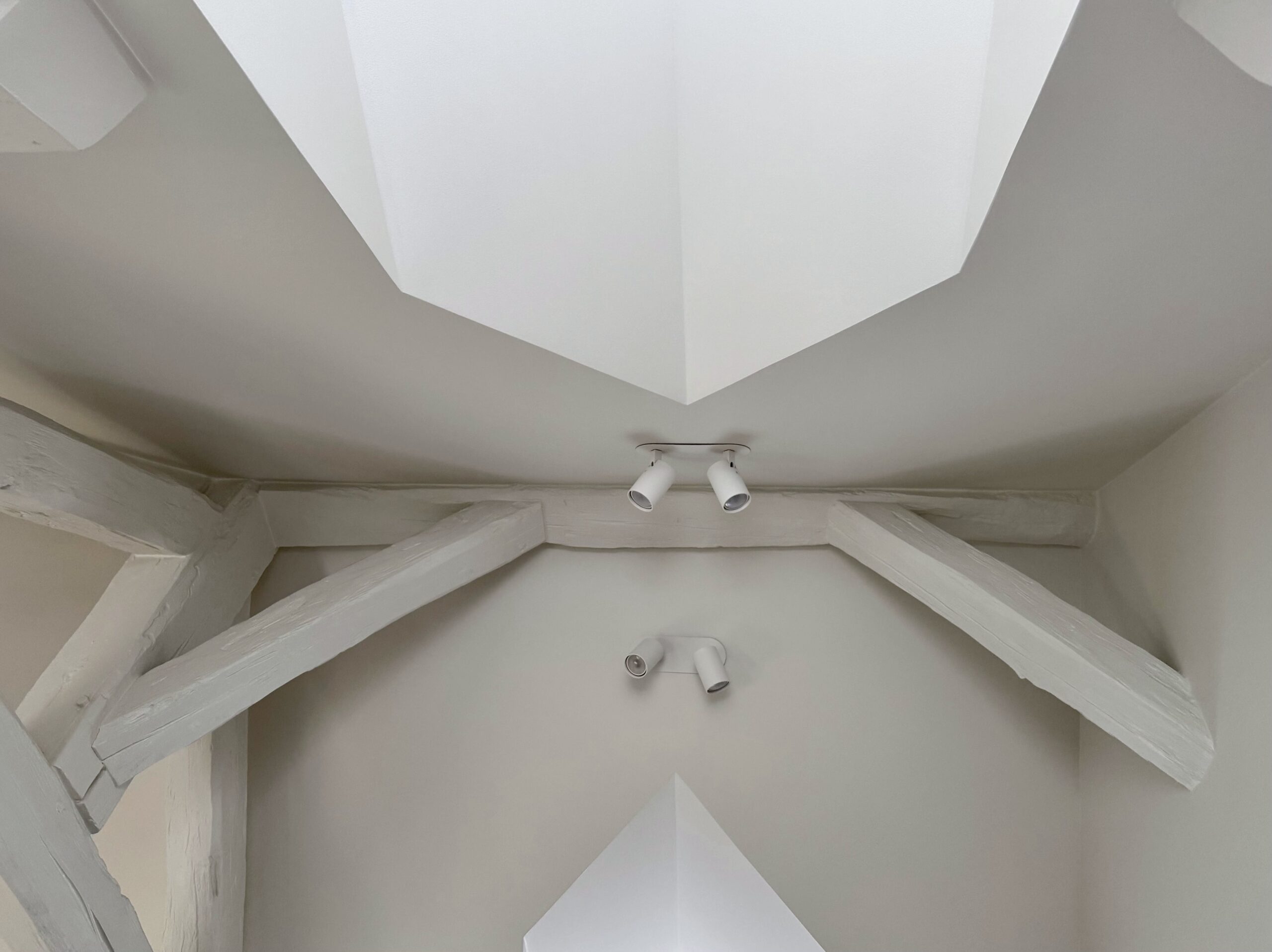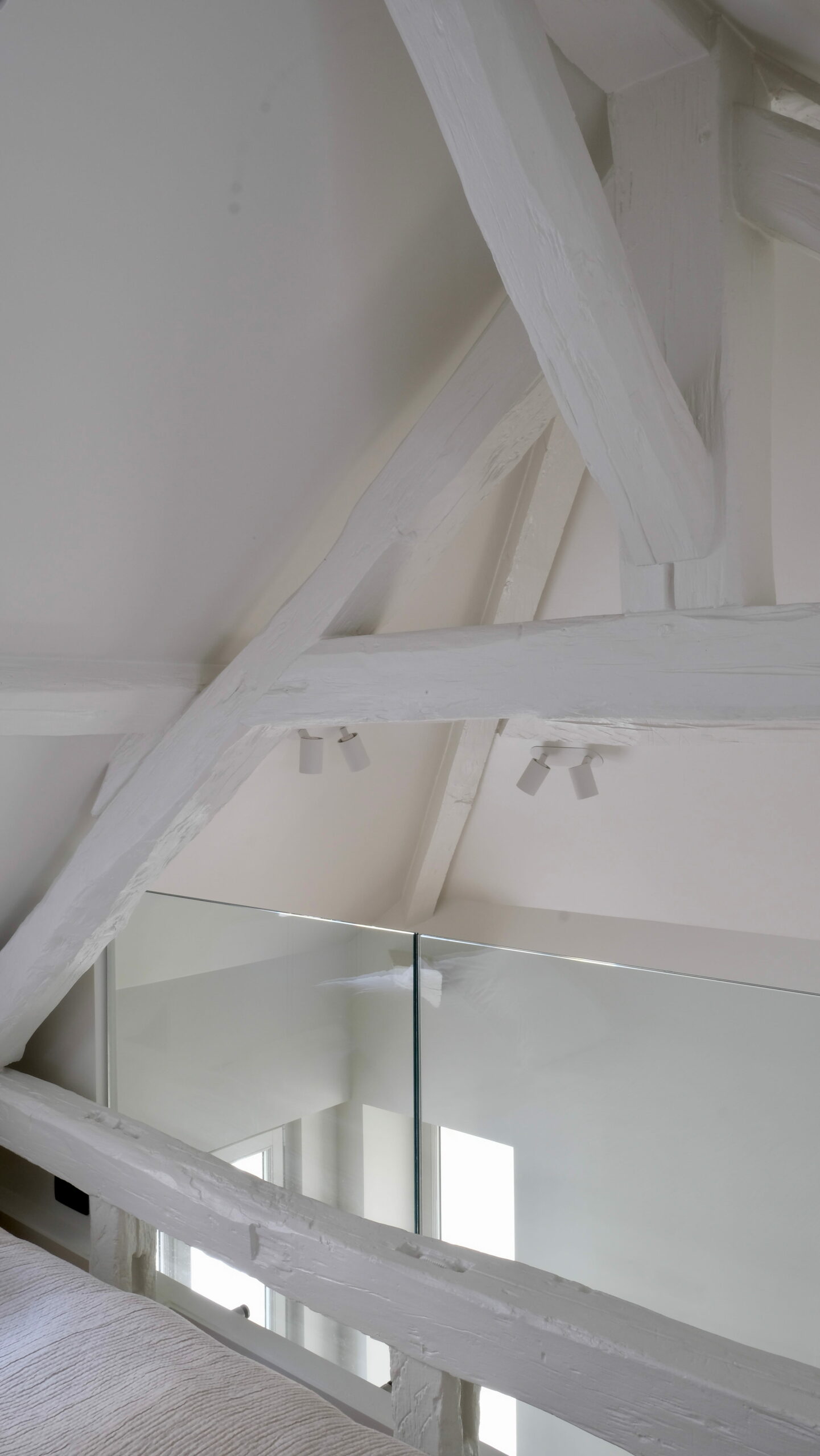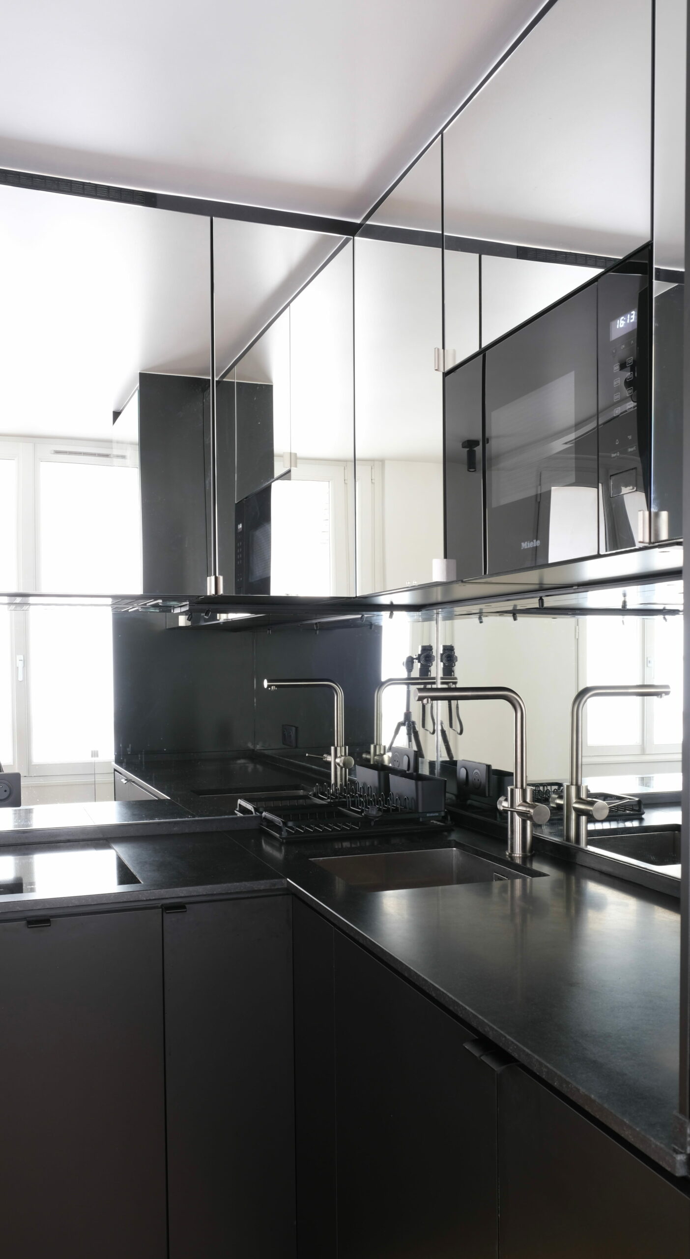 Une partition des espaces a été créée avec des cloisons paravents et le mobilier. Celui-ci est noir, selon le souhait du maître d’ouvrage, et distinct de toute l’enveloppe, traitée en blanc cassé/craie. La charpente est volontairement laissée apparente, bien qu’ayant subi pas mal d’outrages dans de précédentes rénovations, et peinte pour échapper à l’aspect rustique du bois patiné. L’importance des miroirs : en cuisine, sur le seul mur aveugle, ils estompent l’angle et permettent de rester en lien avec l’une ou l’autre fenêtre. En entrée et en SDD, utiles pour s’assurer de sa silhouette.