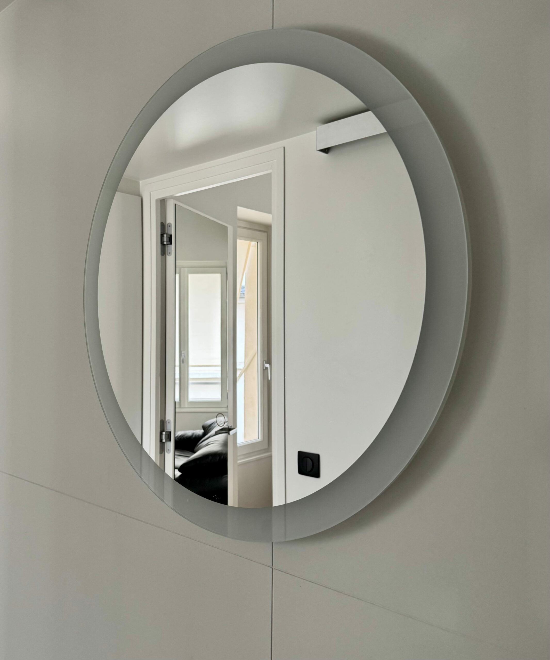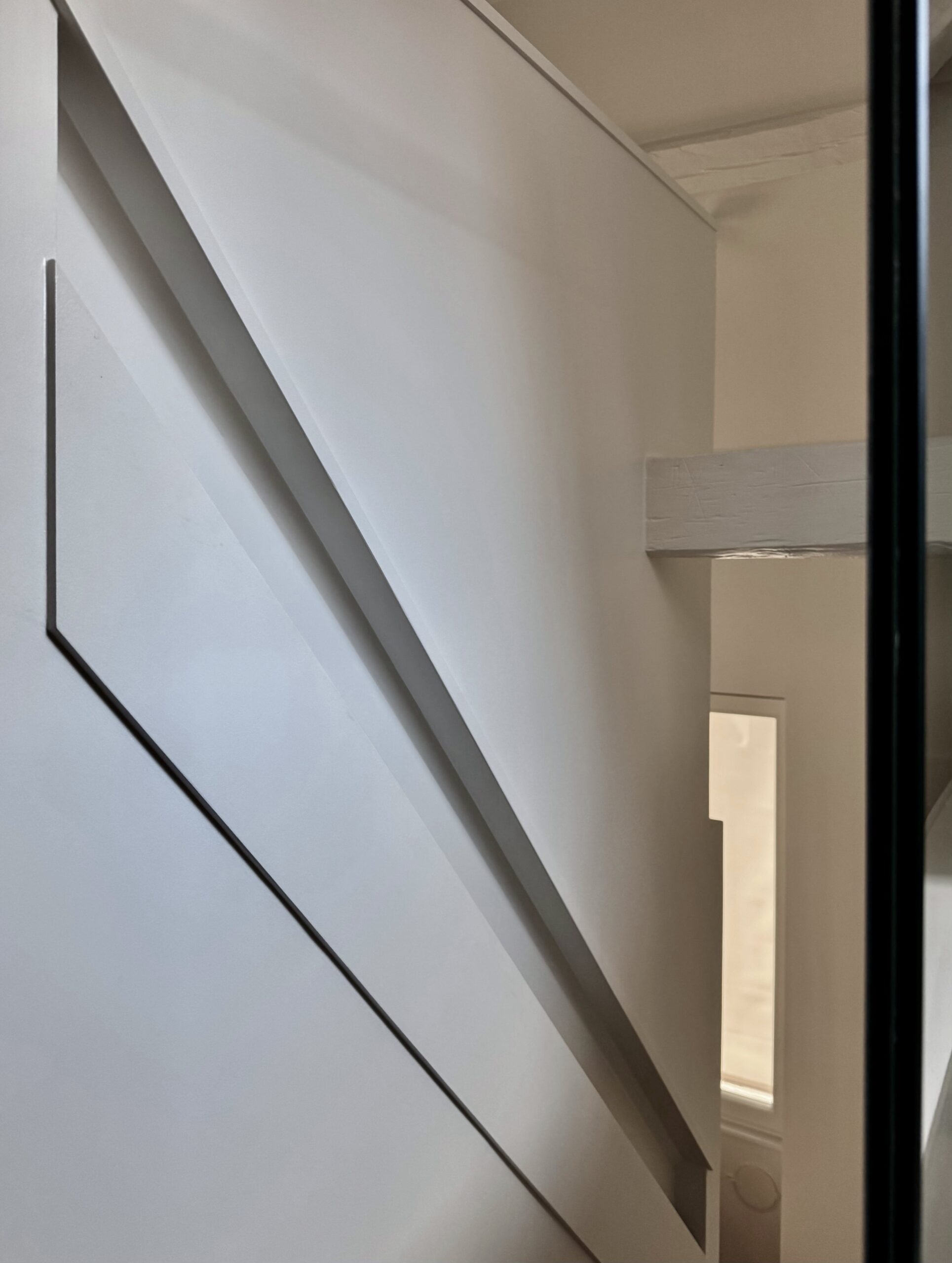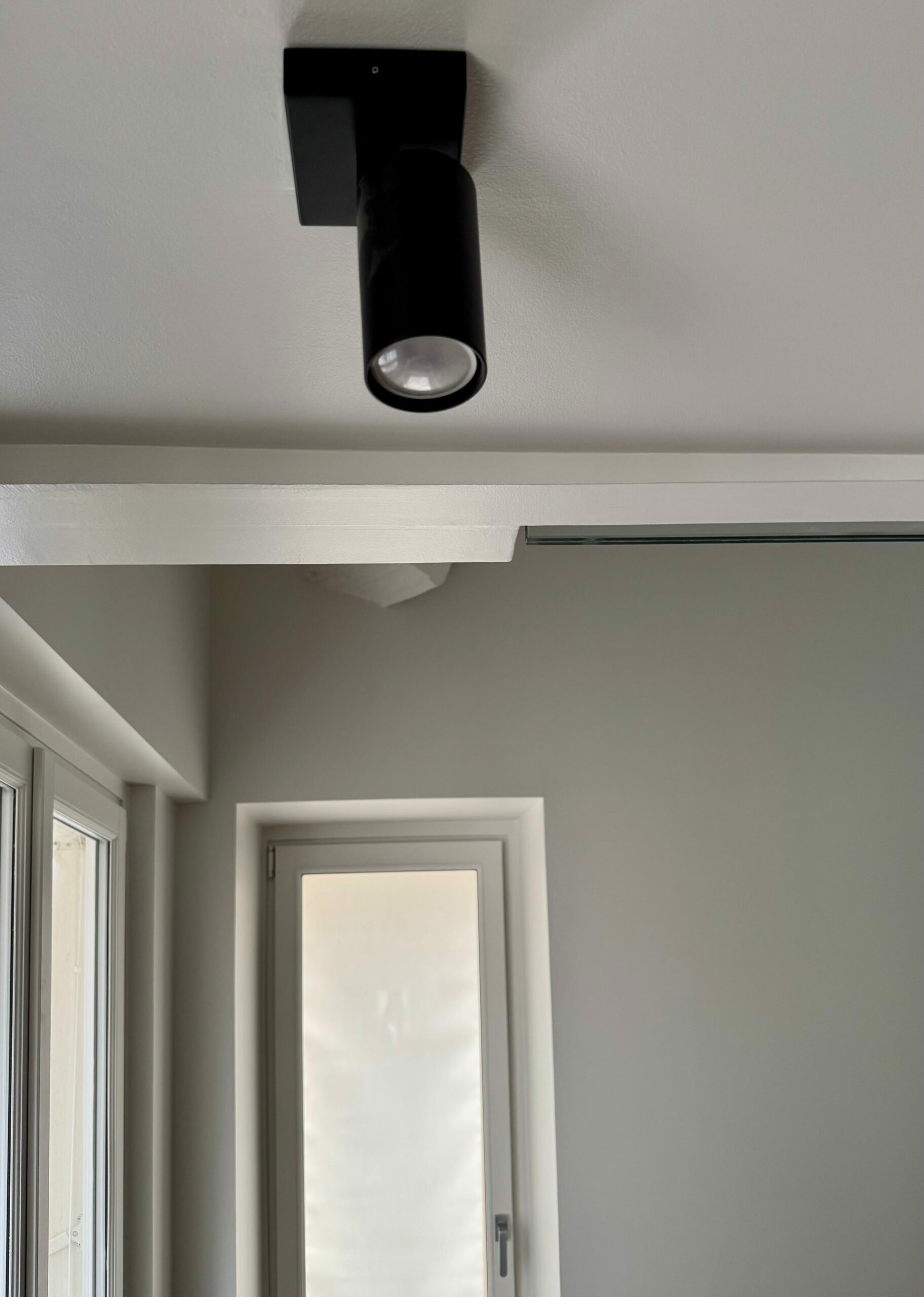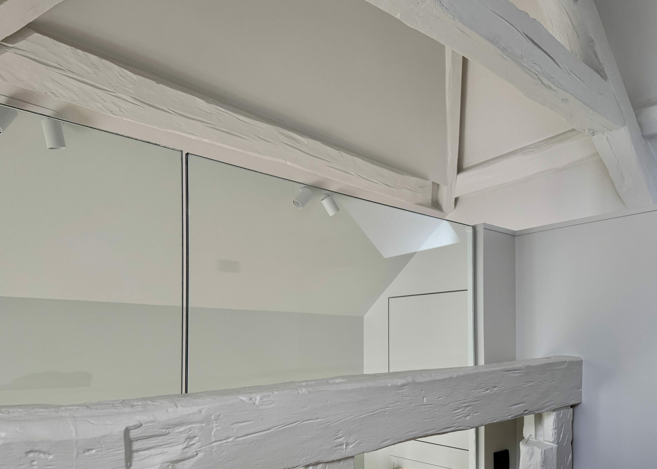 Une partition des espaces a été créée avec des cloisons paravents et le mobilier. Celui-ci est noir, selon le souhait du maître d’ouvrage, et distinct de toute l’enveloppe, traitée en blanc cassé/craie. La charpente est volontairement laissée apparente, bien qu’ayant subi pas mal d’outrages dans de précédentes rénovations, et peinte pour échapper à l’aspect rustique du bois patiné. L’importance des miroirs : en cuisine, sur le seul mur aveugle, ils estompent l’angle et permettent de rester en lien avec l’une ou l’autre fenêtre. En entrée et en SDD, utiles pour s’assurer de sa silhouette.