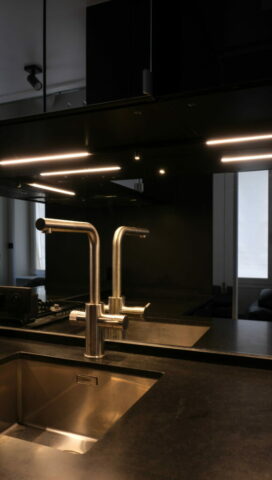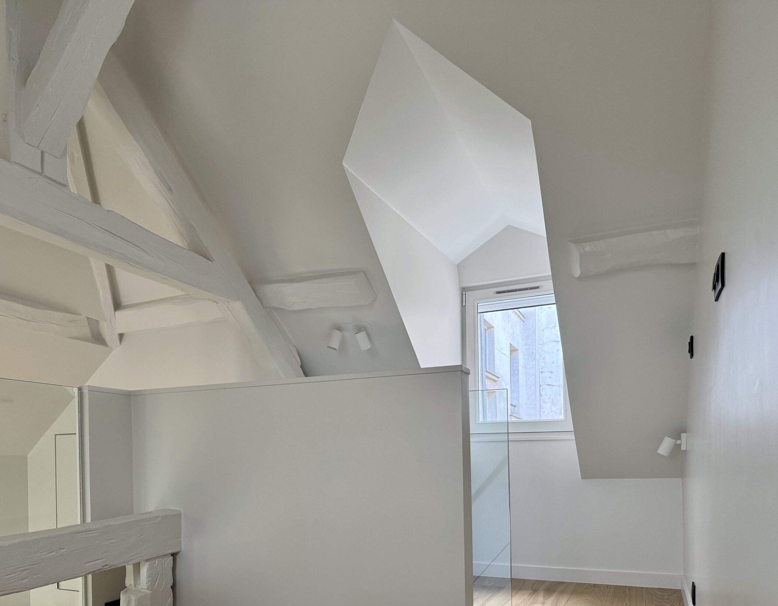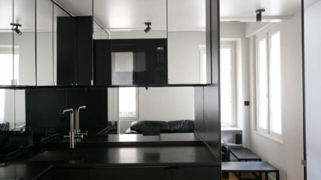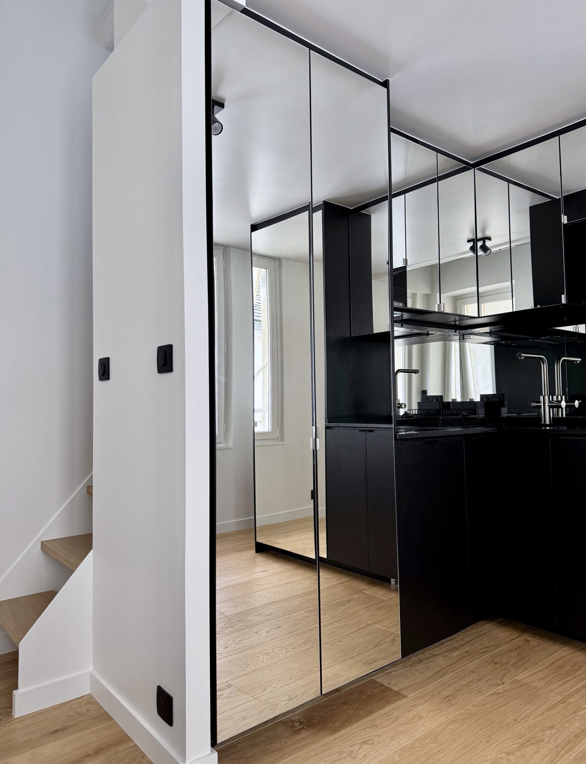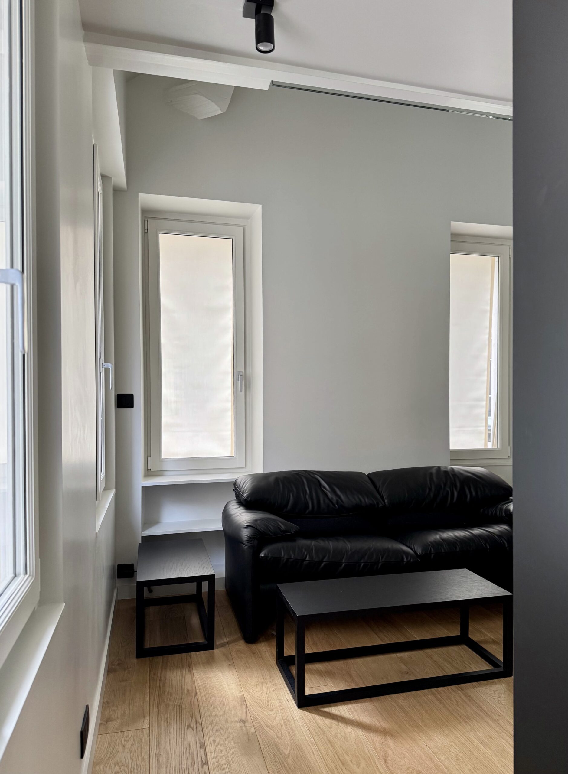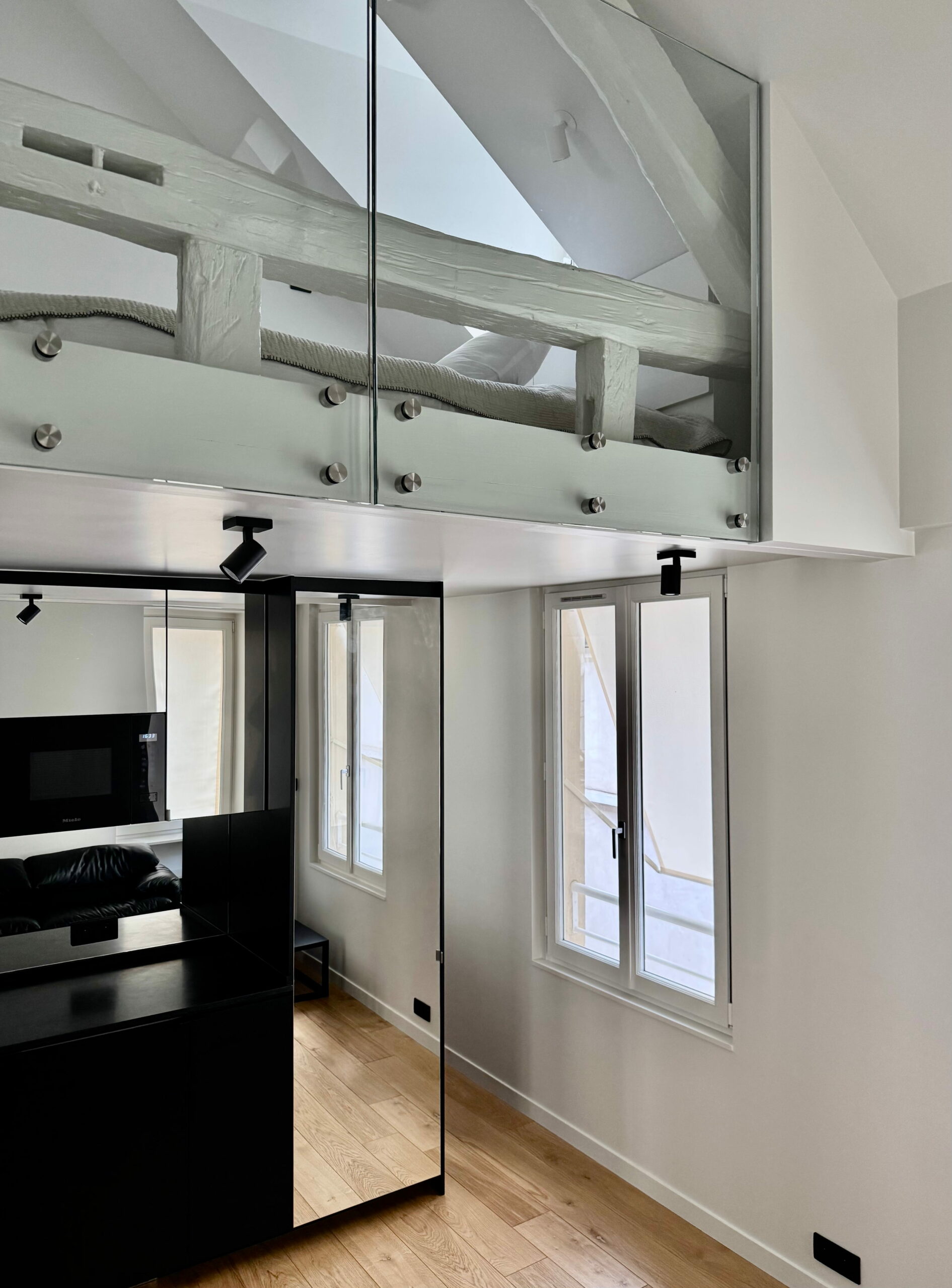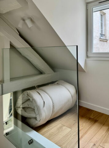 Pour ce pied à terre de 35 m2 (mezzanines comprises), il nous a fallu batailler avec la copropriété, qui n’a pas assumé les désordres découverts à l’occasion du curage, remonter la note du DPE de 3 points car c’était bel et bien une passoire thermique, et bien sûr répondre au programme du maître d’ouvrage, particulièrement dense.