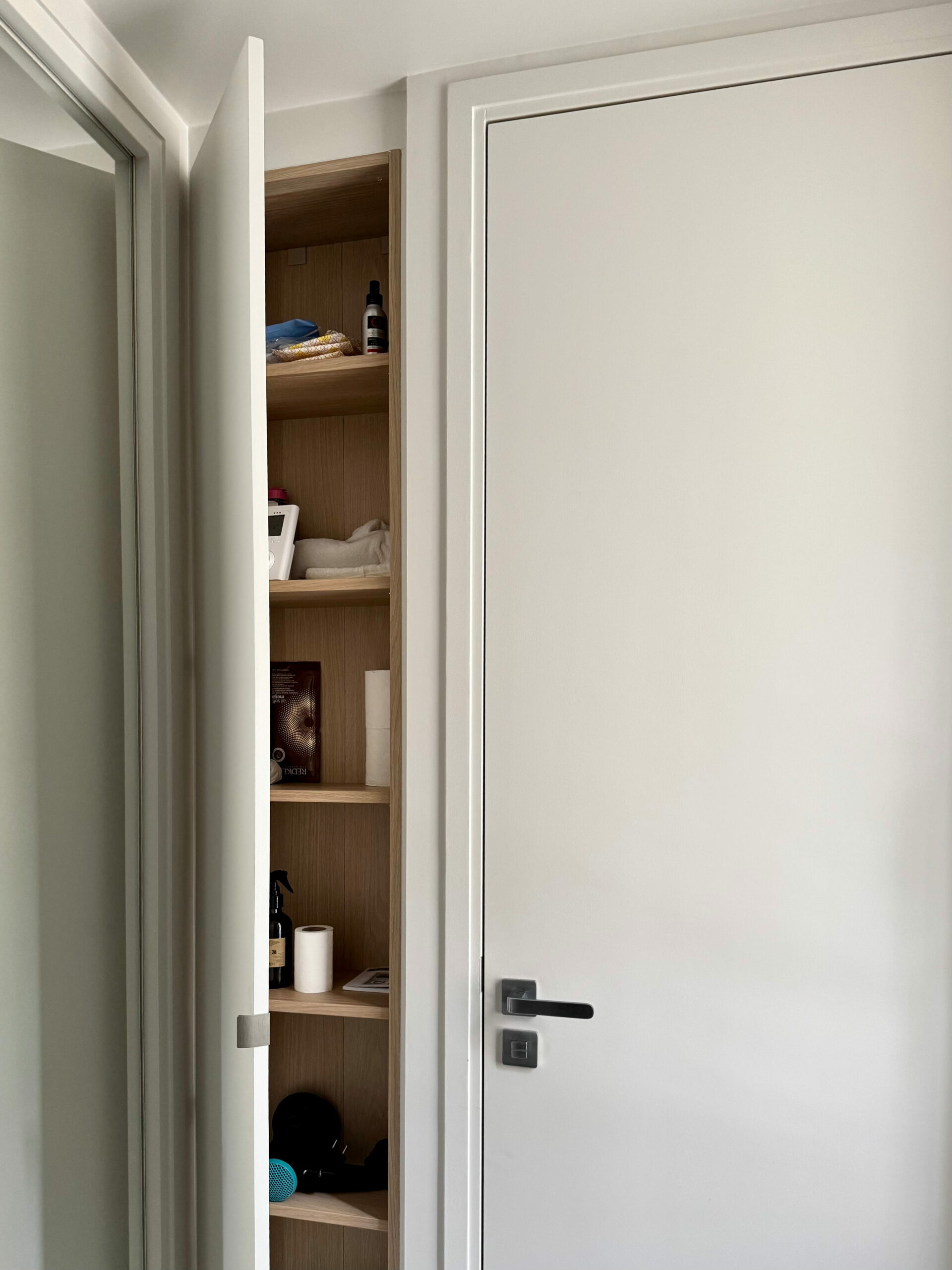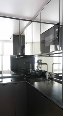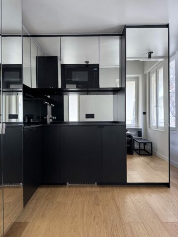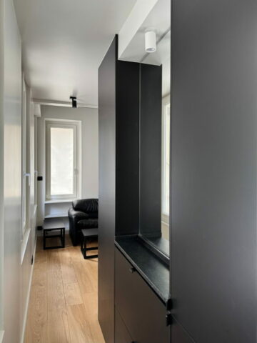 Pour cette famille de trois personnes, il n’était pas question d’un studio de type résidence hôtelière, elle entend bien y vivre « comme à la maison » lors de ses passages à Paris. Cuisiner dans une vraie cuisine, avoir une belle salle de douche, un WC séparé, une buanderie, une bagagerie et des rangements en nombre, y compris pour les chaussures à l’entrée car on s’y déchausse impérativement… Et nous y sommes arrivés.