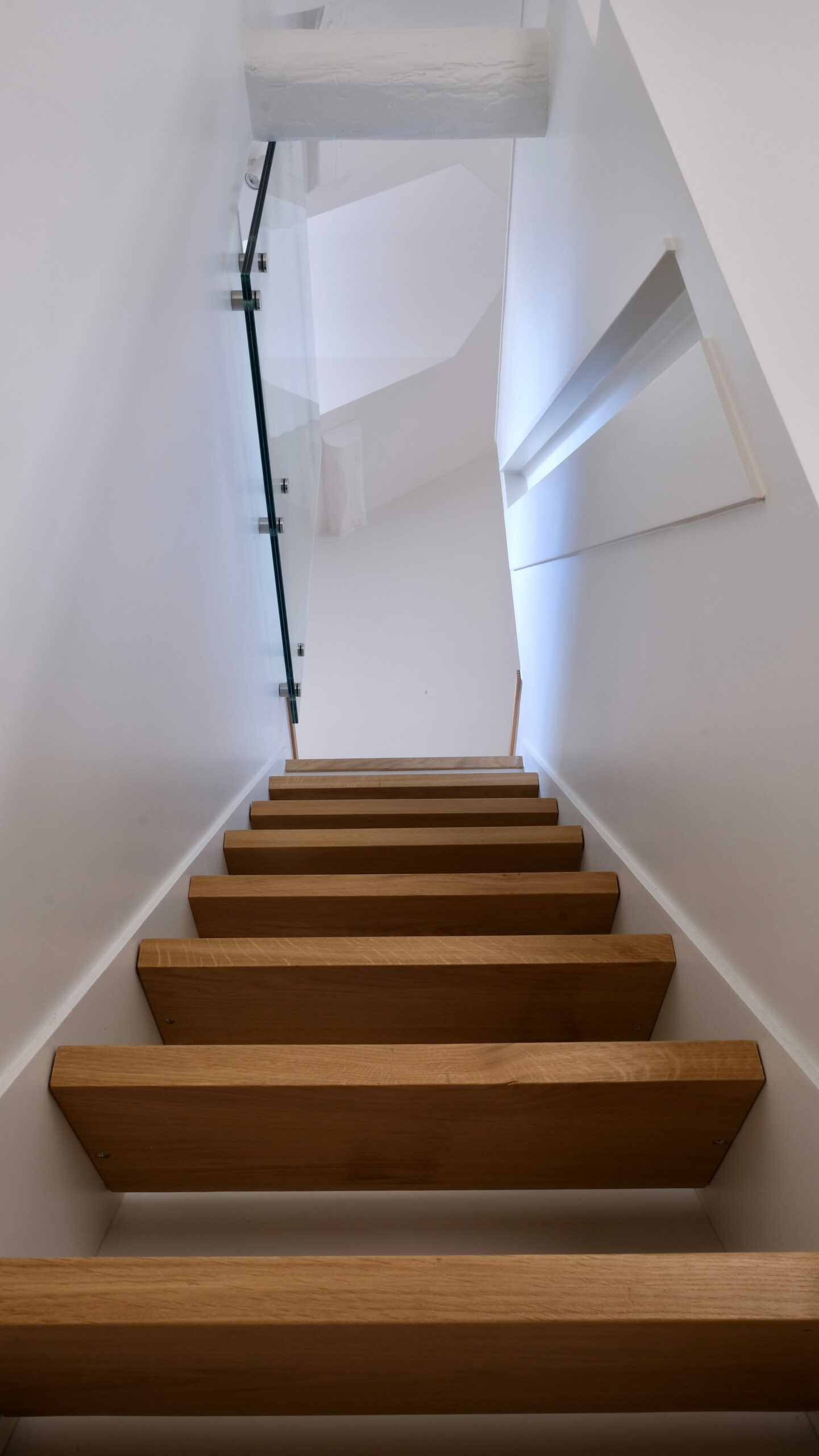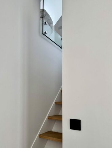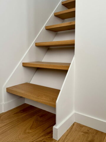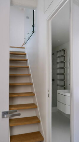 L’escalier à limons métalliques, indépendant des parois, est entièrement démontable et ré-employable si besoin.
