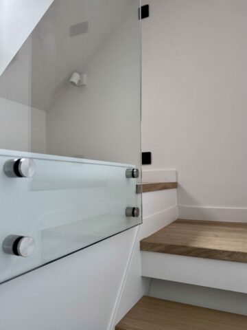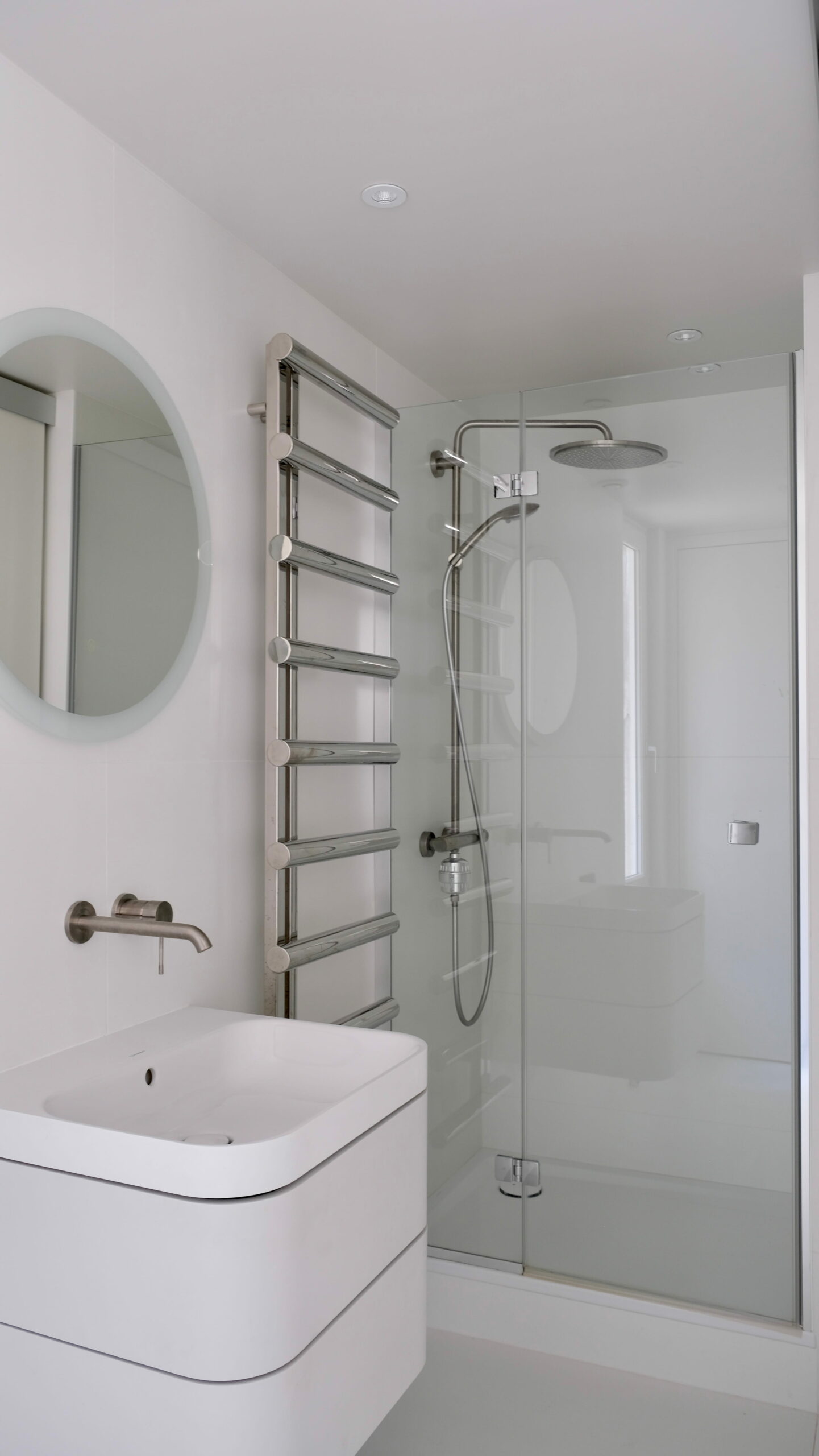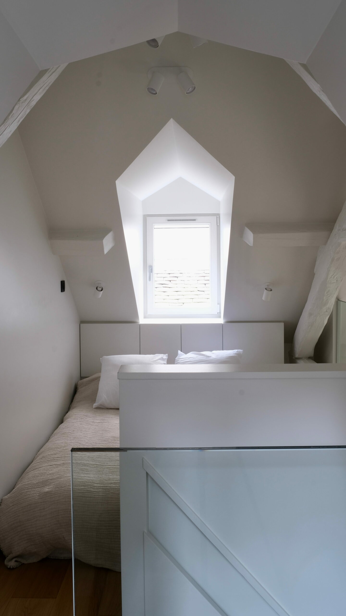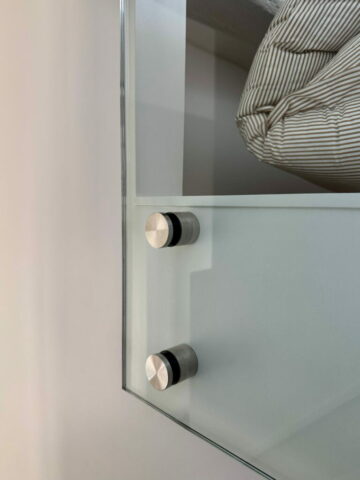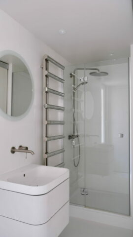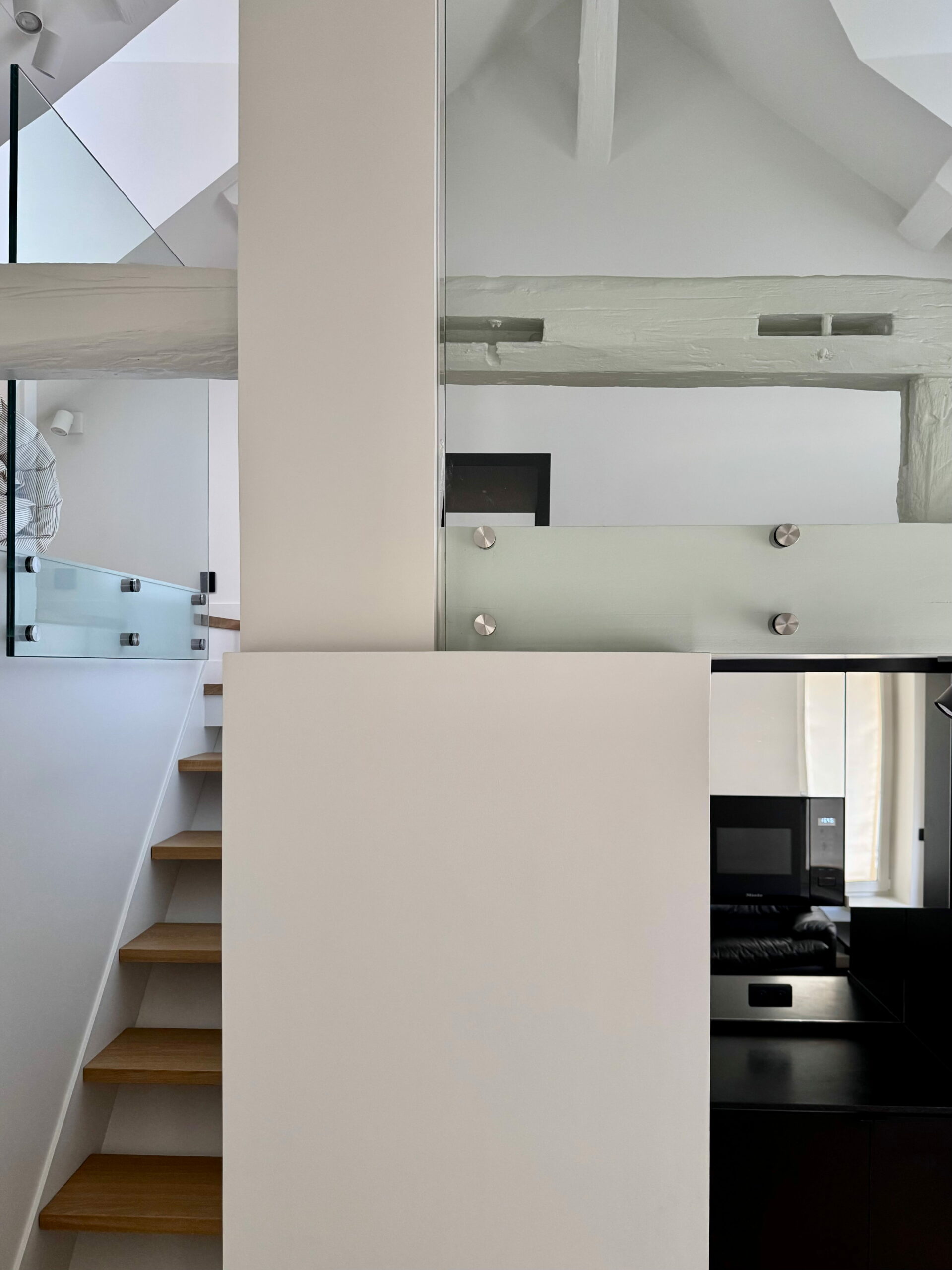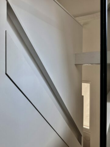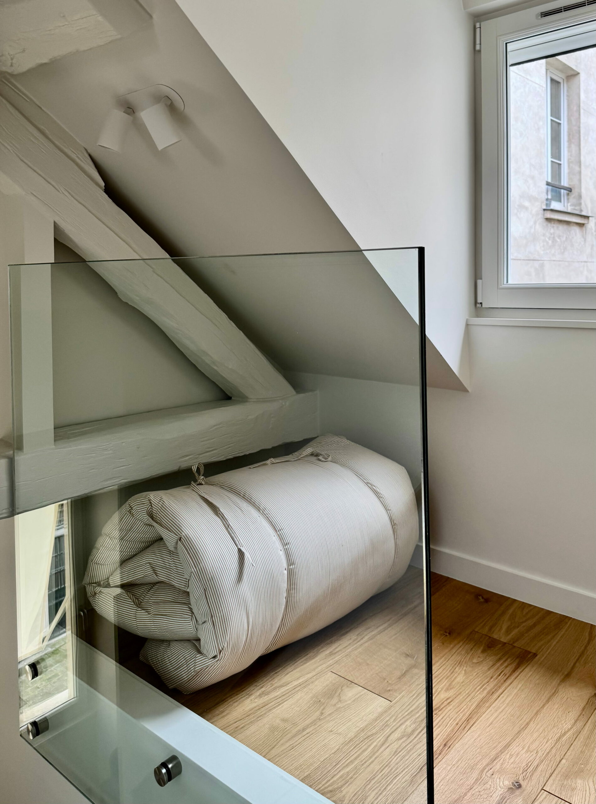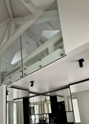 La grande mezzanine a été conservée en l’état, simplement protégée par un garde-corps en verre, c’est le couchage des parents. La petite mezzanine a été recréée pour avoir un volume de salle de douche confortable, elle reçoit le futon de l’enfant. La seule pièce totalement close est la salle de douche, avec le WC, éclairée et ventilée naturellement par une fenêtre. La cuisine, en niche entre les deux dressings, possède tous les équipements nécessaires. Entre les deux espaces, l’escalier, dessiné et réalisé au millimètre près, comme tout le projet d’ailleurs. Y compris la main-courante encastrée souhaitée par le maître d’ouvrage, qui est à la mesure de ses mains !