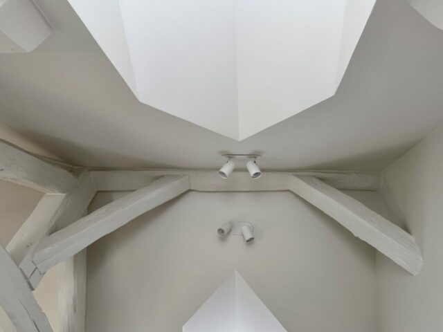 Avec pas moins de six fenêtres, très rapprochées les unes des autres, conçues pour éclairer naturellement l’atelier à toute heure du jour, les deux lucarnes en toiture ont été créées beaucoup plus récemment, il bénéficie de trois expositions, Est, Sud et Ouest. Une belle lumière et beaucoup de déperditions !
